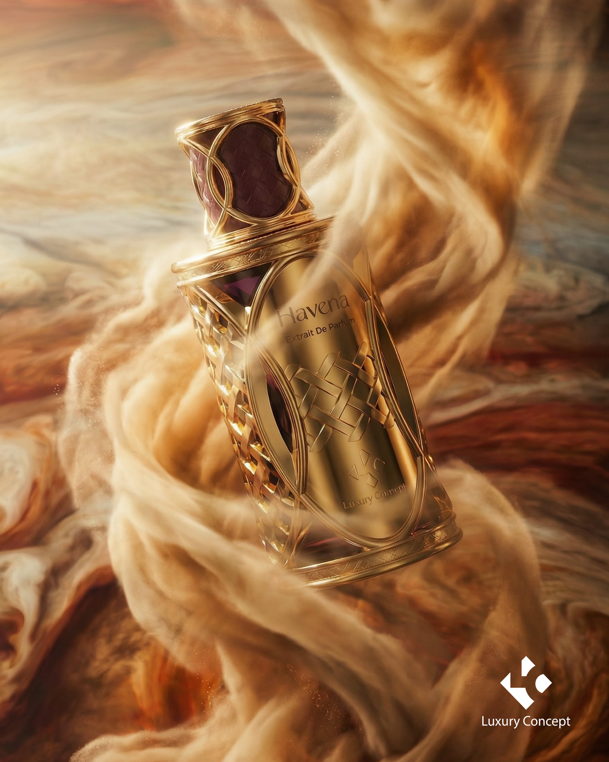Havena suits cooler evenings and social settings. It performs as a long lasting perfume for women who appreciate smooth sweetness balanced by musk. The warmth and wood also make it equally compelling for men. The purple cylindrical bottle with gold detailing, structured netting, and sculpted ringed cap reflects Jupiter’s richness and scale.